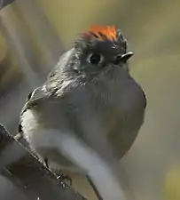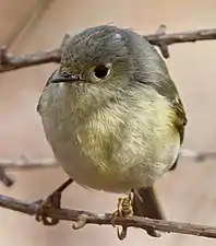 Самець золотомушки рубіновочубої (Regulus calendula) з пригладженим чубчиком
