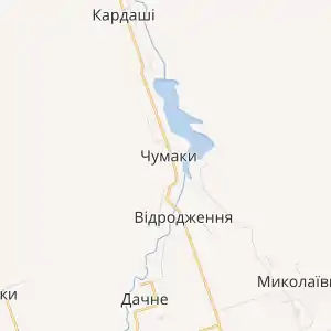 Село Чумаки знаходиться на лівому березі річки Чаплина, нижче за течією примикає село Кардаші. Річка в цьому місці пересихає, на ній зроблена велика загата. Через село проходить автомобільна дорога Т 0427.