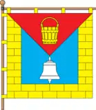 На квадратному синьому полотнищі з жовтою облямівкою, мурованою чорним, білий дзвін. Від верхніх кутів до середини виходить червоний клин, на якому жовте дерев'яне відро. Ширина облямівки дорівнює 1/6 ширини прапора.