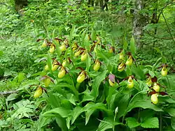 На болотних «острівцях» та добре зволожених ділянках навколо болота зростають мішані ліси, в яких домінуючими породами і підліском виступають ялина, береза, вільха у різних співвідношеннях, а поодинокими сусідами є дуби, ясени, клени. Чагарниковий ярус на ділянках із поживними ґрунтами представлений ліщиною, жимолостю звичайною, вовчим ликом звичайним, на сухіших підвищеннях — горобиною та калиною, у заболочених місцинах — крушиною ламкою і різними видами верби, на колишніх вирубках — малиною й ожиною. Трав'яний покрив у таких лісах дуже густий, в ньому переважають квасениця звичайна, медунка темна, підліски звичайні, горошок весняний, вороняче око звичайне. Саме тут найчастіше трапляються рідкісні зозулині черевички справжні та зубниця бульбиста. Під ялинами великі зарості утворює чорниця, супутниками якої виступають мохнатка волосиста, лохина, плаун колючий[6].