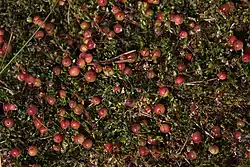 Перехідні болота поєднують у собі флористичні риси верхових та низинних. Зокрема, вони також бувають лісисті та безлісні, причому на лісистих ділянках так само деревостан утворюють пригнічені сосни та пухнасті берези заввишки лише 2—5 м. Однак нижчі яруси таких лісів відрізняються від фітоценозу верхового болота. Серед чагарників тут звичайні верба попеляста і мирзинолиста, у трав'яному покриві переважають осоки й очерет, які часто вкривають непрохідні багнисті трясовини. На відкритих ділянках перехідних боліт ростуть калюжниця болотяна, вовче тіло болотяне, бобівник трилистий, які вирізняються серед навколишньої рослинності яскравими квітами[6].