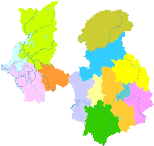 Міський округ поділяється на 2 райони, 1 міський повіт і 9 повітів: