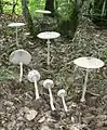 Гриб-зонтик строкатий, плодові тіла різного віку. Шапки від напівкулястих до плоских, з округлим горбком