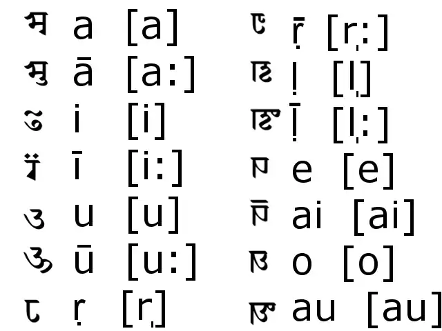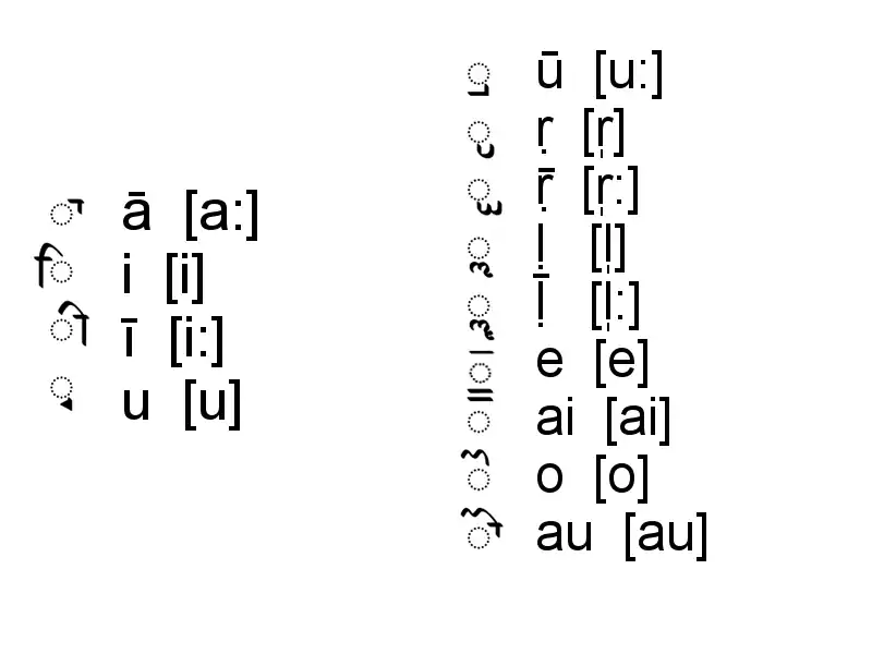 Залежні знаки для голосних слугують для заміни прикріпленого короткого голосного [а] в знаках для приголосних на потрібний голосний.