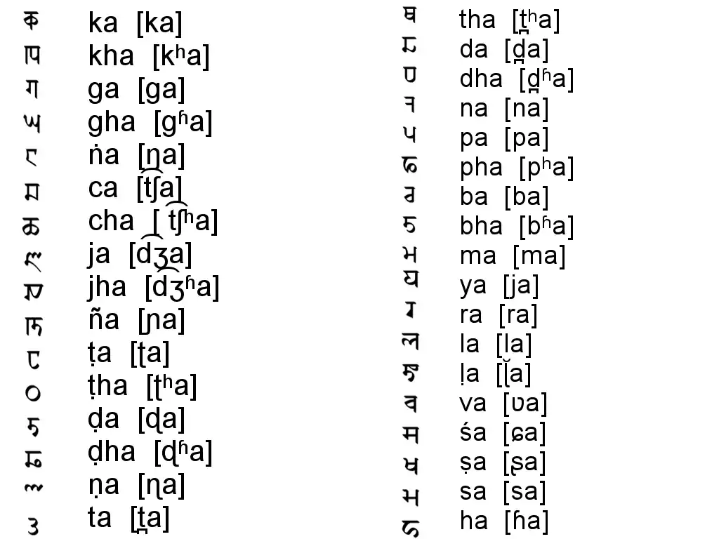 Кожен знак являє собою склад, складаючийся з приголосного та прикріпленого короткого голосного [а]. Щоб змінити в складі цей голосний на інший, або щоб позначити, наприклад, назалізацію, до цього знаку дописують залежний знак для потрібного голосного, або залежний знак для назалізації. Щоб отримати приголосний без голосного, потрібно до знаку, який являє собою склад «приголосний + голосний [а]», додати віраму (знак, відміняючий прикріплений короткий голосний [а]).