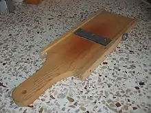 Виготовляється з дерева, металу тощо. Складається зі столу, на якому закріплені під певним кутом нерухомі ножі з легованої сталі. У напрямних пазах по столу рухається прямокутний контейнер, в який поміщають харчові продукти для шаткування.