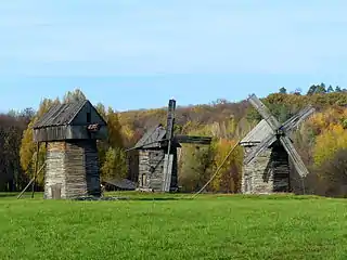 Три рублених шатрових вітряки. Музей у Пирогові.