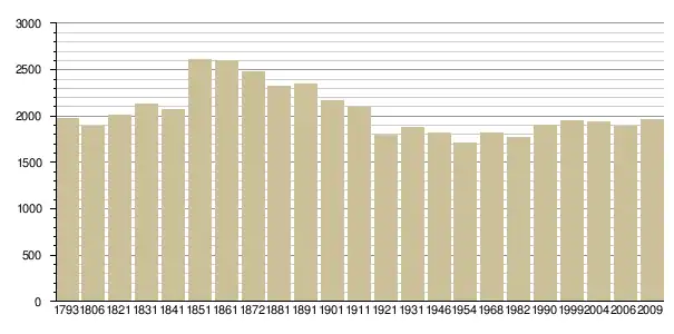 - Cassini : recensements avant 1968 ; recensements INSEE : depuis 1968 ; enquête INSEE : 2004., наведено за французькою вікіпедією