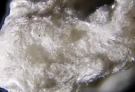 Сингонія гексагональна. Утворює аґреґати голчастих і волокнистих кристалів. Спайність відсутня. Густина 2,65. Колір білий. Блиск шовковистий. Дуже крихкий. Знайдений разом з кальцитом у зоні окиснення родов. Цумеб (Намібія).