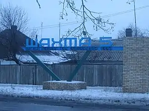 ![]() Стенд із назвою шахти на в'їзді до неї | |