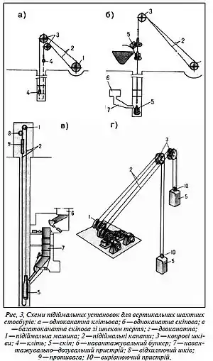 - за типом підіймальних ємкостей — на скіпові, клітьові, скіпо-клітьові, баддяні;