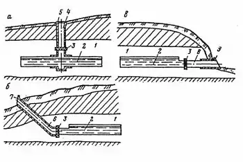 Розкривні виробки в залежності від гірничо-геологічних умов бувають вертикальними, горизонтальними і похилими (див. рис.). Вертикальні або похилі стволи пов'язані з горизонтальними виробками — штольнями. Розкривні виробки призначені для з'єднання виробок-резервуарів з поверхнею, розміщення трубопроводів і експлуатаційного обладнання. Допоміжні виробки — колекторні виробки, камери насосних станцій, експлуатаційні свердловини. Відпрацьовані виробки шахт можуть бути використані за умови забезпечення герметичності та міцності гірських порід, що їх вміщують.