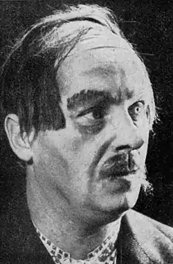 ![]() Шашаровський у ролі «Сусіда», у п'єсі «Народній Малахій», поставленій Ансамблем Українських Акторів, Аугсбург 1946. | ||||
