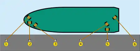 1 — носовий поздовжній, 2 — носовий притискний, 3 — носовий шпринг, 4 — кормовий шпринг, 5 — кормовий притискний, 6 — кормовий поздовжній