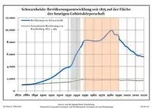 Динаміка населення з 1875 року в сучасних кордонах (Синя лінія: населення; Пунктир: відносна порівняльна динаміка населення землі Бранденбург; Сірий фон: період Третього рейху; Помаранчевий фон: період НДР)