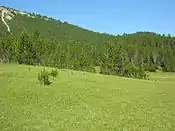 Поле з фоном хвойного лісу