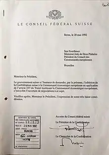 Швейцарія взяла участь у переговорах про угоду про ЄЕЗ з ЄУ, підписала угоду 2 травня 1992 року та подала заявку на вступ до ЄУ 20 травня 1992 року. Швейцарський референдум, проведений 6 грудня 1992 р., Відхилив членство в ЄЕЗ. Як наслідок, уряд Швейцарії припинив переговори про вступ до ЄУ до подальшого повідомлення. Ратифікувавши другий раунд двосторонніх договорів, Швейцарська федеральна рада знизила свою характеристику повноправного членства Швейцарії в ЄУ зі "стратегічної мети" до "варіанту" у 2006 році. Членство продовжувало залишатися метою уряду і було "довгостроковою метою" Федеральної ради до 2016 року, коли заморожена заявка Швейцарії була відкликана. [25] [26] Пропозиція була прийнята Радою держав, а потім Федеральною радою в червні. [27] [28] [4] У листі від 27 липня Федеральна рада повідомила головуючий в Раді Європейського Союзу, що відкликає свою заявку. [29]