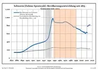 Динаміка населення з 1875 року в сучасних кордонах (Синя лінія: населення; Пунктир: відносна порівняльна динаміка населення землі Бранденбург; Сірий фон: період Третього рейху; Помаранчевий фон: період НДР)