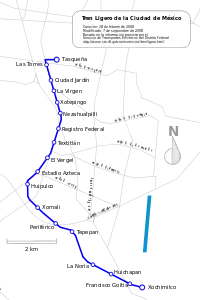 Система швидкісного трамвая складається з однієї лінії, на якій є вісімнадцять станцій (зупинок): Tasqueña (пересадка на метро) — Las Torres — Ciudad Jardín — La Virgen — Xotepingo — Nezahualpilli — Registro Federal — Textitlán — El Vergel — Estadio Azteca — Huipulco — Xomali — Periférico — Tepepan — La Noria — Huichapan — Francisco Goitia — Xochimilco