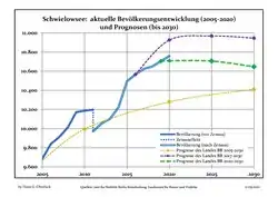 Динаміка населення з 1875 року в сучасних кордонах (Синя лінія: населення; Пунктир: відносна порівняльна динаміка населення землі Бранденбург; Сірий фон: період Третього рейху; Помаранчевий фон: період НДР)