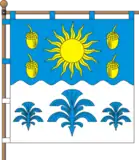 Квадратне полотнище розділене хвилясто горизонтально на дві рівновеликі частини – синю і білу. На верхній частині жовте сонце, що супроводжується чотирма жовтими жолудями, по два з кожної сторони один над одним, на нижній три синіх фонтани води в ряд, середній більший.