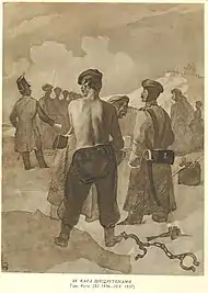 Шевченка звинуватили в написанні віршів, з якими могли посіятись і згодом укоренитися думки про вигадане блаженство часів Гетьманщини, про щастя повернути ці часи й про можливість Україні існувати як окремій державі/[74] Участі поета в Кирило-Мефодіївському товаристві слідство не довело. Шевченка як наділеного міцною будовою тіла призначили рядовим в Оренбурзький окремий корпус на невизначений термін із забороною писати й малювати.[75] У його житті настала смуга тривалої і тяжкої неволі в пустельній околиці царської Росії. 30 травня 1847 року поета передали в інспекторський департамент військового міністерства, де його взяли під арешт як «секретного арештанта», встановивши спеціальний пост вартового.