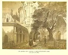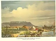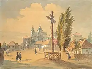 13 (25) травня 1843 року Шевченко з Петербурга виїхав до України.[lower-alpha 4] Завітав до поета Віктора Забіли на його хуторі Кукуріківщина під Борзною. Зупинився у Качанівці на Чернігівщині, у маєтку поміщика Григорія Тарновського)[53]. У червні побував у Києві, де познайомився з Михайлом Максимовичем, Пантелеймоном Кулішем й багатьма художниками, зокрема, з Олексієм Сенчило-Стефановським.[54] Познайомився поет й з багатьма студентами Київського університету. Прогресивна, революційна молодь тепло вітала його, як свого улюбленого поета. Саме в цьому середовищі утворилося тоді Кирило-Мефодіївське товариство. Шевченко оглянув історичні пам'ятки Києва, не раз милувався його краєвидами. З ним постійно був альбом, початий ще в Петербурзі, у якому він малював краєвиди та пам'ятки Києва. Разом з Кулішем, Шевченко відвідав Вишгород і Межигір'я, де оглянули монастир, історія якого тісно пов'язана із Запорізькою Січчю, у своєму альбомі поет зробив малюнок олівцем «Києво-Межигірський монастир». На Полтавщині відвідав Євгена Гребінку в його Убіжищі[55]. 29 червня (11 липня) 1843-го — у день св. Петра і Павла — відвідав разом із ним пишну гостину в хрещеної матері Гребінки, вдови-генеральші Тетяни Вільхівської в її «українському Версалі» в Мойсівці, де познайомився з поетом Олександром Афанасьєвим-Чужбинським та офіцером Яковом де Бальменом (пізніше присвятив йому поему «Кавказ»). У липні 1843 року в Ковалівці Шевченко відвідує Олексія Капніста — учасника руху декабристів, сина автора «Оди на рабство» і комедії «Ябеда» Василя Капніста. Обидва поїхали до Яготина, до Миколи Рєпніна-Волконського, щоб оглянути галерею картин і на замовлення Григорія Тарновського зробити копію з портрета Миколи Рєпніна. Там Шевченко познайомився з Варварою Рєпніною[56]. Того літа він відвідував своїх нових знайомих: Закревських у Березовій Рудці, Якова де Бальмена в Линовиці, Петра Селецького в Малютинцях, Олександра Афанасьєва-Чужбинського в Ісківцях, Ревуцьких[57] в Іржавці, Ґалаґанів у Сокиринцях та Дігтярях. 20 вересня (2 жовтня) 1843 року гостював у рідному селі Кирилівці, Звенигородського повіту, на Київщині в сестри та братів[58].