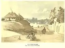 Відвідав Шевченко і Яготин, щоб висловити співчуття щодо смерті батька В. Рєпніної. Звідси він вирушив у Прилуки, в Густинський монастир, де був похований М. Рєпнін.[71] По дорозі в Ромни поет відвідав маєток Г. Ґалаґана в Сокиринцях, подарував йому окреме видання поеми «Тризна». Був Шевченко й у маєтку іншого Ґалаґана — Петра Григоровича. 20—22 липня, у Ромнах, поет відвідав знаменитий Іллінський ярмарок. Тут він познайомився з К. Солеником, одним із фундаторів нового реалістичного українського театру. Під час ярмарку Шевченко три дні жив у наметі власника маєтку в Городищі на Черкащині П. Свічки, сина полковника, який славився в Україні своїми дивацтвами. Познайомився він також з поміщиком І. Якубовичем, роменським повітовим маршалком — батьком декабриста О. Якубовича. Влітку й восени 1845 року Шевченко відвідав й маєток А. Родзянка у Веселому Подолі. Побував тоді Тарас Григорович й у маєтку брата Аркадія — Платона Родзянка у Вишняках. Під час літньої подорожі Шевченко продовжував малювати, наприклад, по дорозі до Полтави він спинився в Решетилівці, в маєтку О. Попова, де виконав два малюнки «В Решетилівці» — тушшю, сепією та аквареллю.[72] У Полтаві Шевченко зустрівся з другом юнацьких років Ф. Ткаченком, з яким разом працював у В. Ширяєва, жив на одній квартирі, вчився у К. Брюллова. Відвідав поет оселю автора «Енеїди», І. Котляревського, де виконав акварельний малюнок його будинку. З Полтави у серпні Шевченко виїхав до Переяслава, де жив його друг, лікар А. Козачковський.