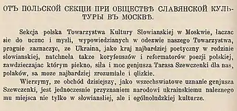 «Московська Міська Дума, на засіданні 22-го сього лютого, одноголосно постановила: в день вшанування пам'яти великого українського поета Т. Г. Шевченка покласти до підніжжя його бюсту вінок від Московського Городського Громадського Управління. …
