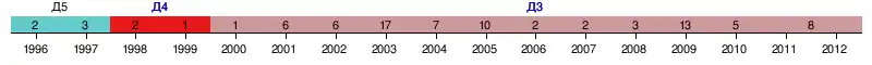 | 2004 | II дивізіон, зона «Захід» | 7 | 14 | 9 | 9 | 52-40 | 51 | 1/256 | |