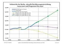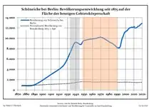 Динаміка населення з 1875 року в сучасних кордонах (Синя лінія: населення; Пунктир: відносна порівняльна динаміка населення землі Бранденбург; Сірий фон: період Третього рейху; Помаранчевий фон: період НДР)