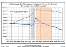 Динаміка населення з 1875 року в сучасних кордонах (Синя лінія: населення; Пунктир: відносна порівняльна динаміка населення землі Бранденбург; Сірий фон: період Третього рейху; Помаранчевий фон: період НДР)