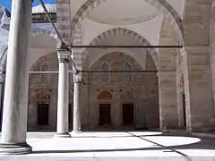 Мечеть оточена арочною галереєю, що прикрашена білим та червоним мармуром разом з аркадами, які тримаються на мармурових та гранітних колонах утворила паперть[7]. По обидві сторони паперті піднімаються два багатокутні мінарети, прикрашені рельєфним орнаментом. З верху кожного балкон (шюрфе) з виступами[7].