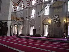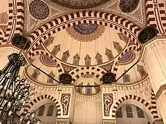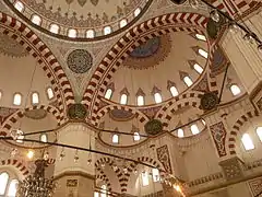 Інтер'єр мечеті у цілому симетричний, обрамлений напівкуполами за всіма чотирма сторонами (архітектурний експеримент Сінана). Усередині будівлю прикрашає кольорове скло та вінки з кам'яними квітами.