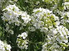 Суцвіття — китиця 6-8 см завдовжки, яка при дозріванні плодів видовжується. Квітки дрібні, білі, рідше — рожевуваті. Чашолистики відігнуті, завдовжки до 2,5 мм. Листочки оцвітини широкі, оберненояйцеподібні, на верхівці злегка виїмчасті, біля основи звужені, 4-5 мм завдовжки. Тичинки довгі, їхні нитки щирококрилаті з зубчиками. Зав'язь сидяча. Стовпчик видовжений, зберігається при достиганні плоду. Приймочка тупа, короткодволопатева. Плід — яйцеподібний або майже кулястий запушений стручечок 2-7 мм завдовжки. У його гніздах міститься від 4 до 10 насінин, розташованих у два ряди. Насінини безкрилі, злегка сплюснуті, еліптичні або кулясті.