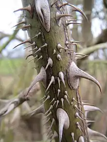 Багаторічна рослина, нанофанерофіт[4]. Листопадний кущ із компактною, оберненопірамідальною кроною, заввишки 120—150 см, рідше — до 2-3 м[5]. Гілки на початку розвитку спрямовані вверх, потім вигинаються дугою. Пагони червонуваті або зелені, вкриті численними червонувато-бурими колючками двох типів — великими і малими. Великі колючки розташовані на зрілих пагонах, вони мають широку основу, серпасту форму (загнуті назад) та сильно стиснуті з боків. Малі колючки вкривають пагони будь-якого віку, вони тонкі, прямі, на молодих гілках, особливо на квітконосах, щетиноподібні, гнучкі, на старих гілках — тверді, голчасті.