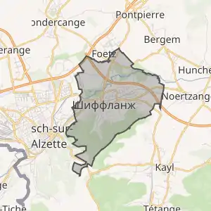 ![]() Комуна Шиффланж (помаранчевий), кантон Еш-сюр-Альзетт (темно-червоний) та округ Люксембург (темно-сірий) на карті Люксембургу | ||||