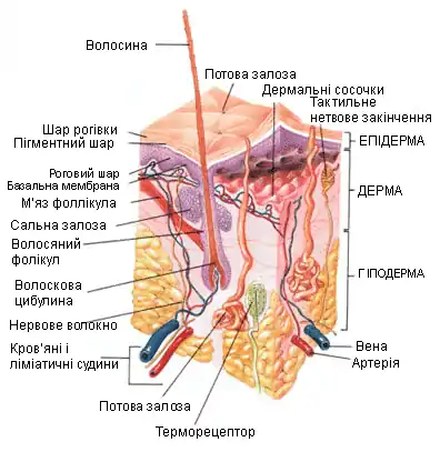 Шкіра складається з епідермісу, дерми і підшкірно-жирової клітковини (гіподерми).