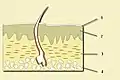 - Епідерміс (epidermis) містить п'ять шарів епідермальних клітин. Найнижчий шар — базальний. Він розташовується на базальній мембрані і являє собою 1 ряд призматичного епітелію. Відразу над ним лежить шипуватий шар (3-8 рядів клітин з цитоплазматичними виростами), потім іде зернистий шар (1-5 рядів плоскуватих клітин), блискучий (2-4 ряди без'ядерних клітин, помітний на долонях і стопах) і роговий шар, що складається з багатошарового зроговілого епітелію. Епідерміс також містить меланін, який забарвлює шкіру і викликає ефект засмаги.