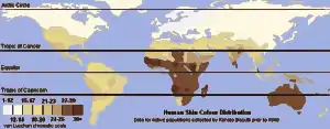 Хроматична карта поширення кольорів шкіри людини. Дані зібрані до 1940 року.