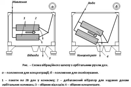 Вібраційні багатодечні шлюзи з орбітальним рухом дек КШМ-72 і «Бартлез-Мозлі» (рис.) застосовуються для вилучення важких мінералів із тонкоподрібнених продуктів (– 0,071 мм).
