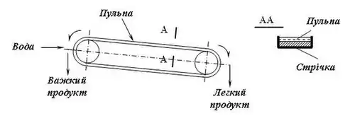 Стрічка натягнута між двома барабанами (приводним і натяжним), закріпленими на рамі. Конструкцією передбачена можливість регулювання кута нахилу робочої поверхні. Вихідний матеріал завантажується на верхню (робочу) гілку стрічки, що рухається назустріч потоку пульпи. Легкі фракції змиваються водою і розвантажуються з нижнього барабана, а осілі на стрічку важкі фракції змиваються за допомогою бризкала після огинання стрічкою ведучого барабана.