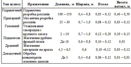 До основних технологічних і конструктивних параметрів шлюзів належать параметри потоку, жолоба і вловлюючих покрить. Вони визначаються в основному за практичними даними і напівемпіричними формулами.