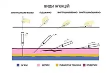 Можливо введення під шкіру, або всередину шкіри. При цьому перевагами підшкірного введення ліків є те, що вони забезпечують надійність дії препаратів і можливо введення їх самим хворим. Недоліки підшкірного введення ліків полягають в поганому усмоктуваність препарату при недостатньому периферичному кровообігу; крім того, повторні ін'єкції в одне і те ж місце викликають атрофію жирової тканини, що призводить до порушення абсорбції[11].