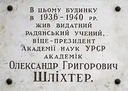 - Шліхтеру О. Г. меморіальні дошки // Київ: Енциклопедичний довідник. — К., 1981. — С. 701.