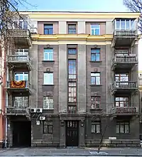 Цегляний, тинькований будинок стоїть на червоній лінії забудови. Складається із чотирьох секцій. Центральна частина шестиповерхова, решта — п'ятиповерхова. У будинку запроєктовані квартири з однією, двоми і трьома кімнати. Входи до секцій влаштовано з вулиці, а проїзди на подвір'я — по краях будинку.