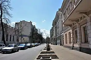У середині XIX ст. забудова вулиці мала садибно-особняковий характер, ця особливість зберігалася майже до середини 30-х років XX ст. Тут містився губернаторський палац Київської, Волинської та Подільської губерній, де мешкали всі генерал-губернатори. У першій половині XIX ст. на вулиці мали садиби головним чином представники аристократичних родин - Одоєвські, Трубецькі та колишньої козацької старшини - Туманські, Санковські, Константиновичі, Сулими. В кінці XIX ст. великі садиби почали продавати, на вулиці стали оселятися київські 1-ї гільдії купці, власники цукрових заводів, члени київських банків. У 10-х рр. XX ст. додалося відразу декілька багатоповерхових прибуткових будинків за номерами 3, 16, 30, 36/7. Власники цих будинків акцентували своє соціальне становите розміщенням на фасадах родових гербів[9].