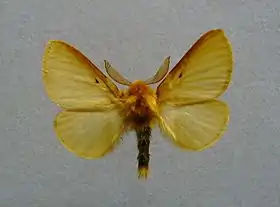 Розмах крил — 35-55 мм. Статевий диморфізм невиразний. Забарвлення крил одноманітне вохристо-жовте, у самок — світложовте. На передньому крилі є невелика чорна пляма. Тіло дуже пухнасте.