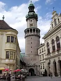 - Пожежна вежа. 60-метрова вежа збудована в стилі неоренесанс. Первинна вежа була зведена у XI столітті на римському фундаменті й з того часу неодноразово перебудовувалась. У нижній частині вежі розміщена «Брама вірності» як пам'ять про референдум 1921 року, коли громадяни міста проголосували за належність Шопрона до Угорщини. Браму прикрашено девізом «Civitas Fidelissima» (Найвідданіші громадяни).