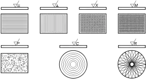 Умовні позначення структури поверхні наведені на наступному рисунку. Умовні позначення напрямку нерівностей вказують на кресленику при необхідності.